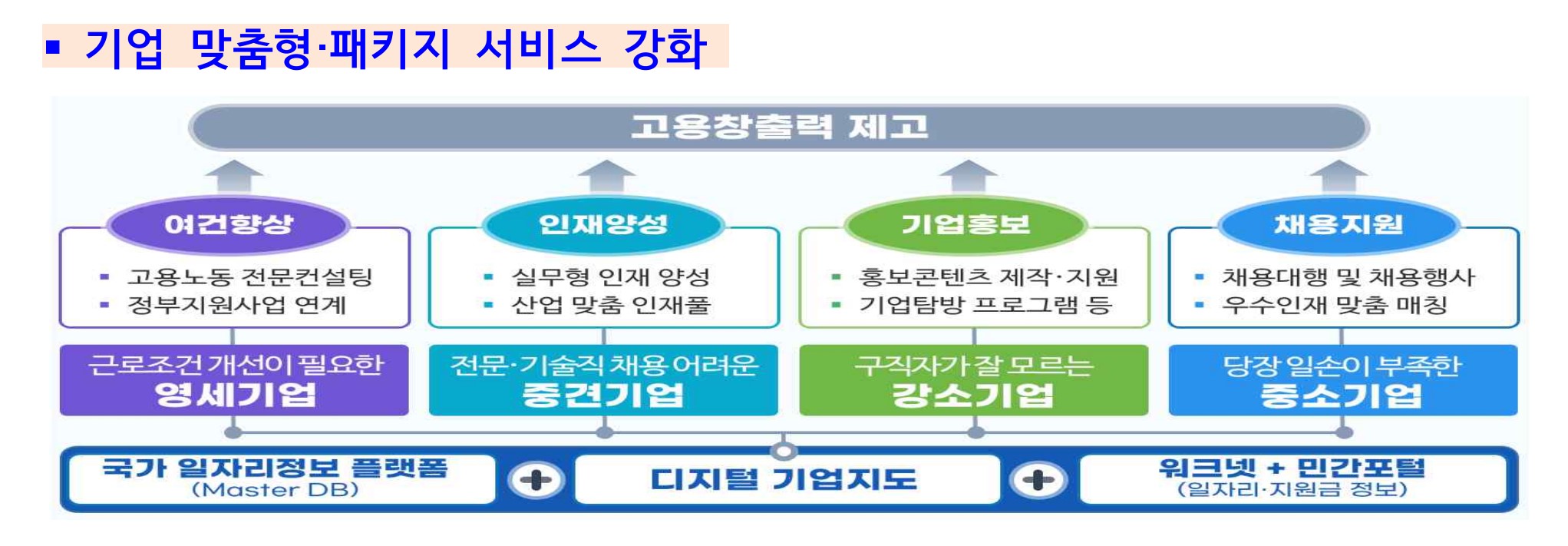 구직자 중심으로 운영되던 고용센터, 고용장려금 지급업무에 편중되었던 고용센터(기업지원과)의 업무가 기업의 가려운 곳을 긁어주는 업무로 전환하여 기업지원 기능이 강화됩니다. 기업 도약보장 패키지를 더욱 활성화하여, 기업이 필요로 하는 실제적인 문제들을 해결하는 것을 목표로 합니다. 기업의 인력수급 상황 모니터링에 기반하여 구직자 취업지원훈련을 실행하고, 이를 통해 양성된 맞춤형 핵심인재를 구인난이 심각한 기업들에 매칭하여 기업의 구인난을 해소합니다. 뿐만 아니라 해당 기업에 산업안전 컨설팅을 지속적으로 실행하여 근로여건이 개선된 안정적 일자리가 되도록 환경을 지원합니다.