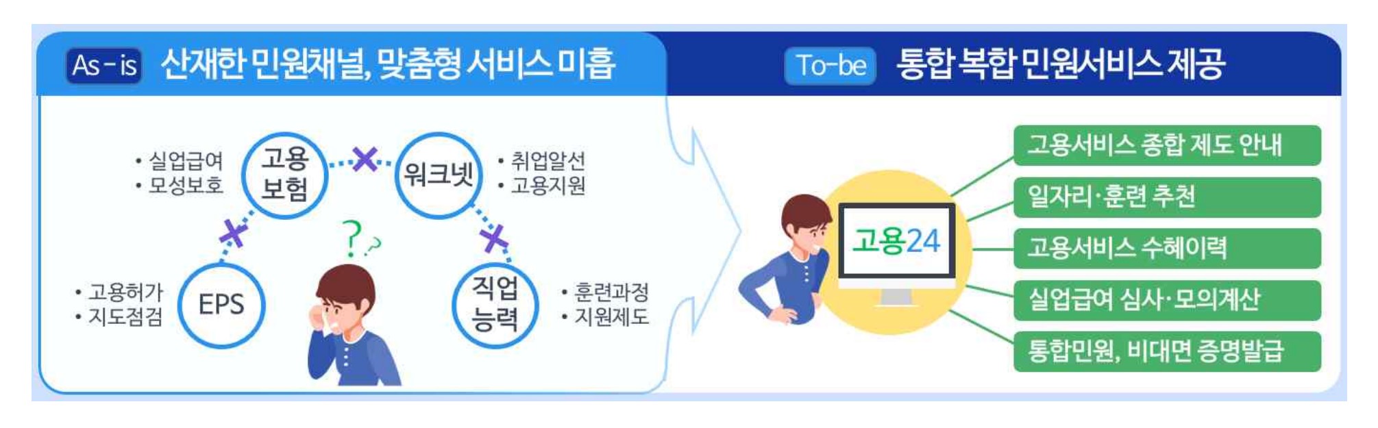 경력직 직원들은 행정관리 업무에 편중되어 다양한 구직 욕구를 갖고 있는 구직자들을 상담, 훈련하고 기업과 매칭하는 업무에 소홀하게 되고, 신규 직원들이 진행하기에는 경험과 자질 면에서 취약했습니다. 이러한 문제점들을 디지털 기반의 업무를 도입하여 업무 효율성과 전문성을 제고할 수 있는 환경으로 전환합니다. 인공지능을 접목한 디지털 기반의 업무 고도화는 민원서비스의 편의성을 높일 뿐만 아니라 현장 경험이 풍부한 경력 직원들의 상담지원 서비스를 활성화하여 고용서비스 전문기관으로서의 위상을 갖춰 고용센터를 운영되게 변모시킬 것입니다. 또한 구직자 보호와 함께 관련 상업을 육성하기 위해 민간과의 협업을 강화하고 각종 규제를 혁신할 계획입니다. 이와 관련된 자세한 사항은 관련 보도자료 첨부파일을 내려받으셔서 확인해 보시기 바랍니다.