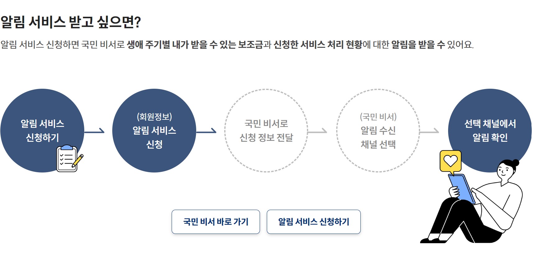 보조금24 의 슬로건은 '단 한 명의 국민도 정부 혜택에서 소외되는 일이 없도록!'입니다. 이처럼 보조금24 홈페이지나 어플을 통하면 나에게 해당하는 다양한 정부 보조금 혜택을 찾아서 신청할 수 있습니다. 첫째로, 10,000여 개에 달하는 다양한 혜택들 중에서 내가 받을 수 있는 혜택들만 일목요연하게 찾아내고 신청할 수 있습니다. 내가 아니더라도 가족관계등록부에 기재된 가족이라면 나를 대신하여 찾아보고 신청할 수 있답니다. 예를 들어, 외지에 거주하는 자녀가 고향에 계신 연로한 부모님을 대신하여 맞춤안내를 조회하여 확인된 혜택들을 신청할 수 있습니다. 반대로 고향의 부모가 외지에 나가있는 자녀들이 받을 수 있는 혜택들을 조회, 확인, 신청하는 것도 가능합니다. (이때, 사전 정보제공 동의는 필수) 둘째로, 신청이 완료되면 국민비서 기능이 - 카카오, 네이버, SMS, 토스, 신한은행, KB 등 - 본인이 원하는 채널로 혜택에 대한 알림을 제공하여 줍니다. 일일이 보조금24에 재접속하여 확인할 필요가 없습니다. 혜택을 받을 때가 되면 신청해서 받아가라고 알려주고, 처음 신청할 당시 받을 수 없던 혜택도 자격변동이 발생하여 받을 수 있는 상황이 되면 그것도 알려줍니다. 똑똑한 AI 기반 추천서비스는 내가 자주 검색하고 찾아본 혜택들을 나 대신 열심히 찾아내서 신청하라고 보내줍니다. 예를 들어, 임신과 출산에 관한 서비스를 자주 클릭하고 찾아봤다면, 30대, 여성, 무주택, 임신, 출산, 저소득층과 관련된 키워드 수혜서비스를 추천해 주는 방식입니다.