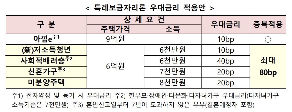 만기는 10년, 15년, 20년, 30년, 40년, 50년 등 6가지가 있으며, 40년 만기와 50년 만기는 신혼부부에게만 해당하며 각각 만 39세 이하, 만 34세 이하이어야만 합니다. 대출 기본금리는 우대형(4.65~4.95%)과 일반형(4.75~5.05%)이 있으며, 차주의 특성에 따라 최대 90bp까지 금리 우대가 가능하여 3.75~4.05% 까지 대출 금리를 낮출 수 있습니다. 중도상환수수료는 면제될 예정입니다.